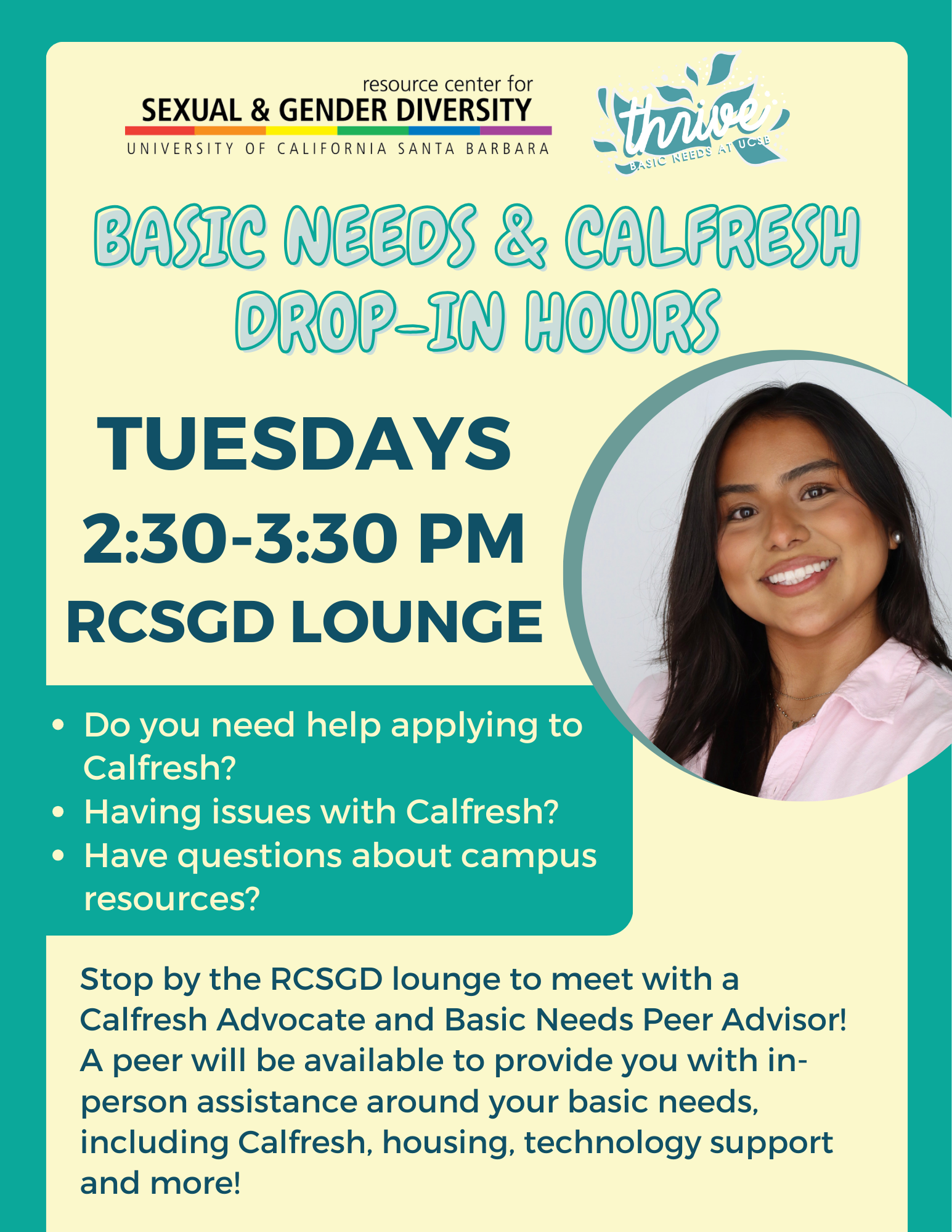 Do you need help applying to Calfresh? Having issues with Calfresh? Or have questions about campus resources? Stop by the RCSGD lounge to meet with a Calfresh Advocate and Basic Needs Peer Advisor! A peer will be available to provide you with in-person assistance around your basic needs, including Calfresh, housing, technology support and more!